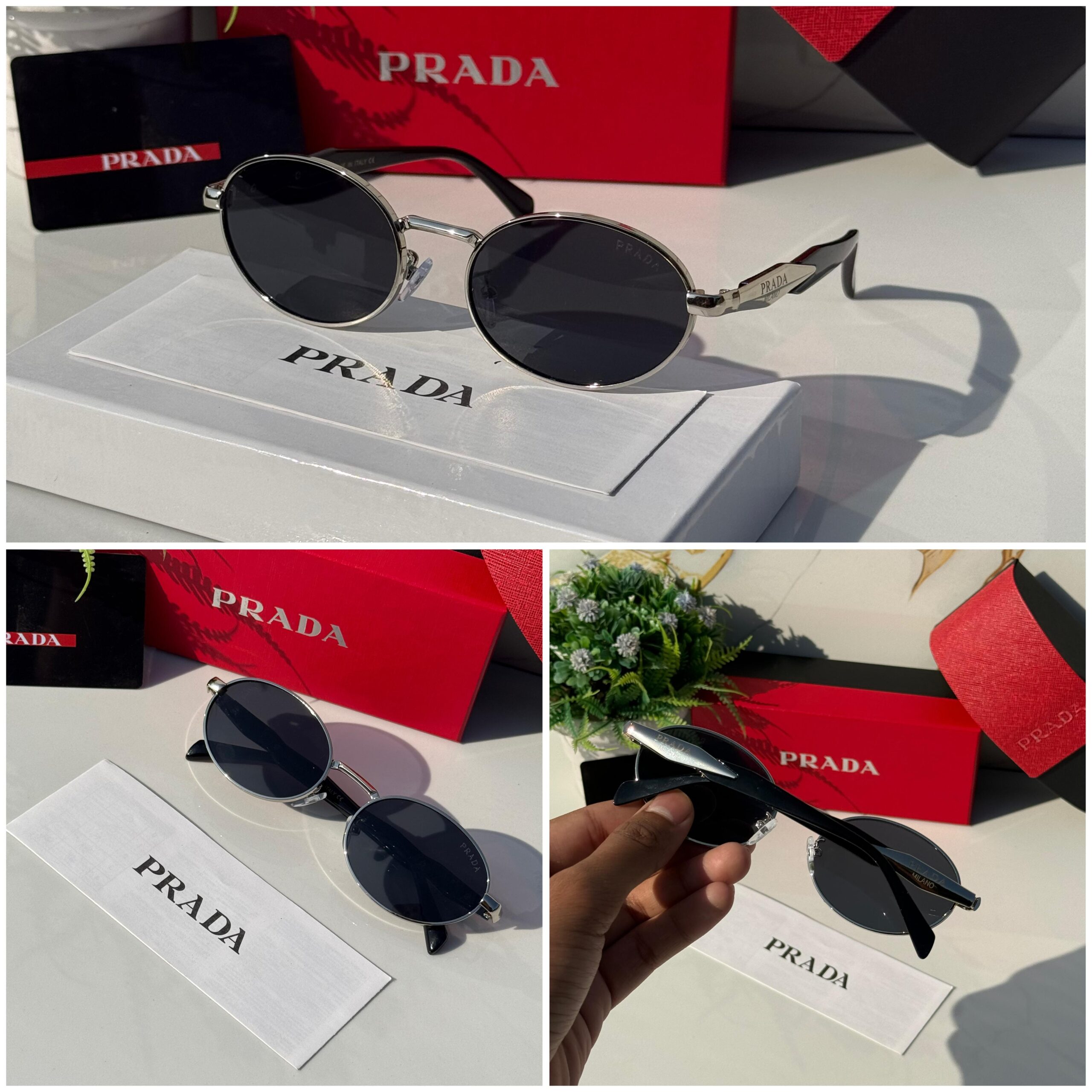 Prada Milano Design: Sophisticated metal frame with iconic logo detailing.
